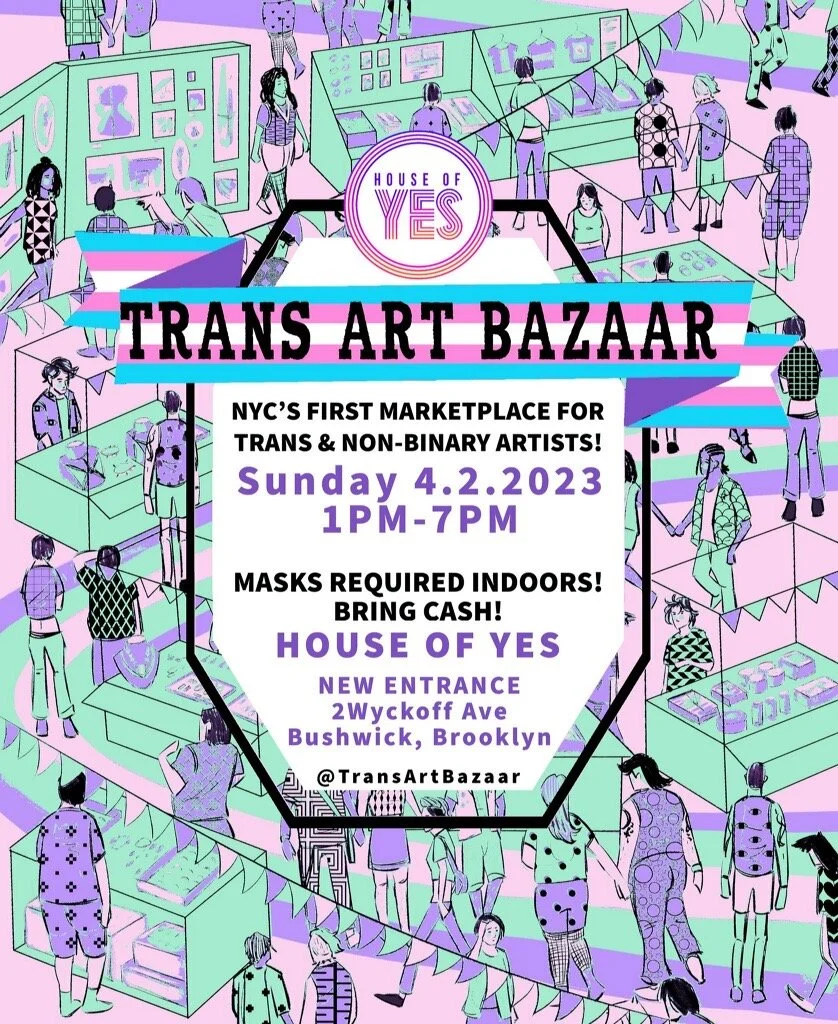 Spring into this amazing year of Trans Art Bazaar with our FIRST Bazaar of 2023 happening on Sunday, April 2nd at House of Yes! The warmth of summer is just around the corner, and the local Trans/NB community is here for you to stock up on all the summer goodies you may need! Tattoos, stickers, art, jewelry; come find it at the Trans Art Bazaar!